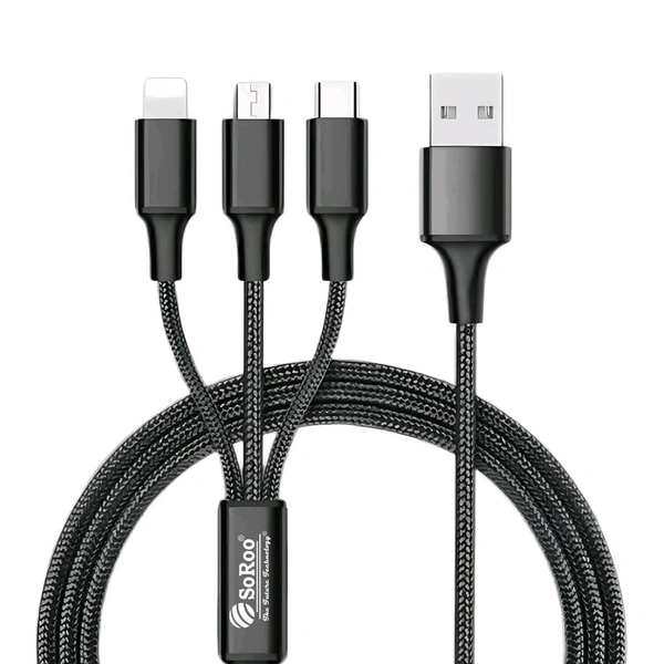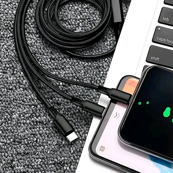 The 3-in-1 data cable, measuring 1200mm in length, is designed to provide efficient and versatile charging solutions for modern devices. Its primary feature is fast charging capability, ensuring that your devices charge quickly and efficiently, saving you time and hassle.