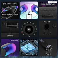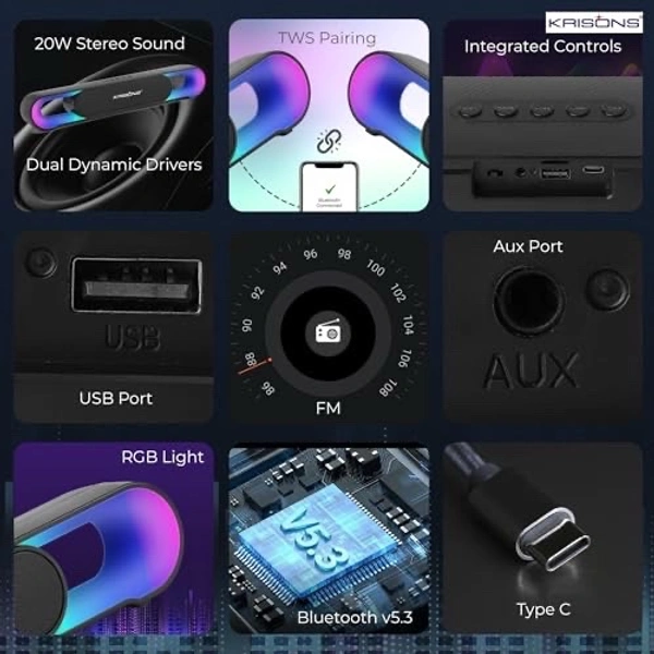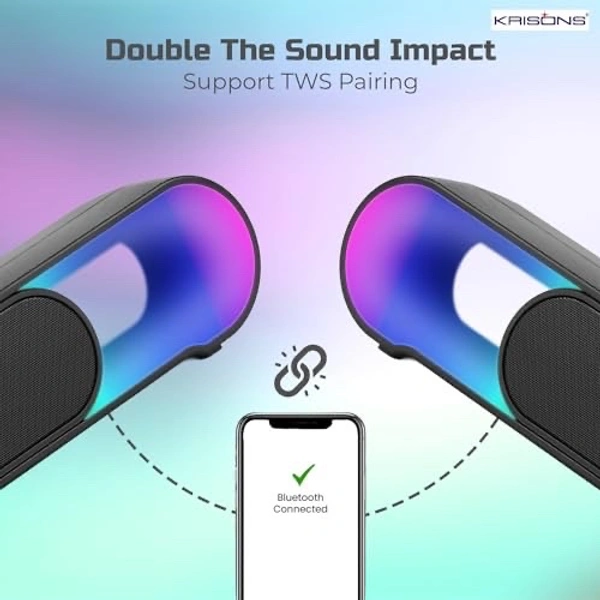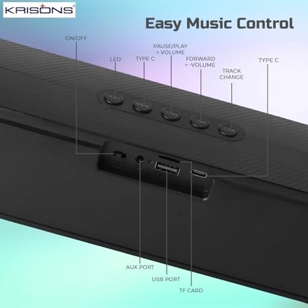 Experience immersive audio with the Krisons SB002 Bluetooth Soundbar, featuring stunning RGB LED lighting that adds a vibrant visual dimension to your entertainment setup. This sleek and lightweight soundbar supports True Wireless Stereo (TWS) pairing, allowing you to connect two units for enhanced stereo sound. The modern connectivity options include Bluetooth 5.3 for wireless streaming, USB Type-C port, traditional USB slot, and an AUX port for versatile device compatibility. With its TF card slot, you can directly play your stored music collection. The elegant black design and compact form factor make it a stylish addition to any desk or entertainment centre. The intuitive control buttons on top provide easy access to essential functions, while the RGB lighting creates an engaging atmosphere that complements your music. Perfect for enhancing your audio experience whether you're watching movies, gaming, or enjoying your favourite music.