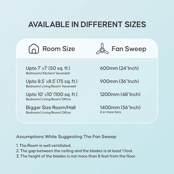 - Speed Size Features : 600 mm Wide Blade Set, 800 RPM High Speed, Air delivery 230 CFM, Number of Speed setting β 5. Suitable for Kitchen / Veranda / Balcony / Room.