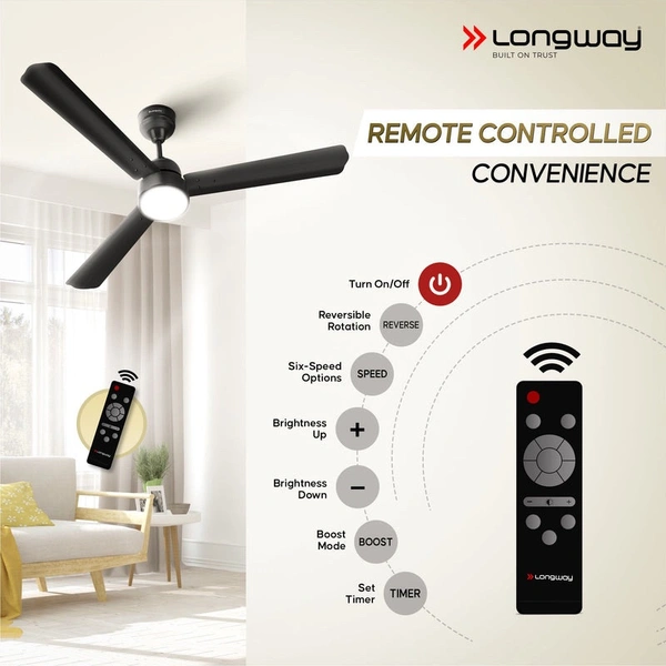 Give a new and refreshing look to your decor with the elegant design by Longway. The Longway BLDC Ceiling Fan offers energy-efficient cooling, reducing power usage while maintaining powerful airflow. It’s quiet, brushless motor ensures a peaceful environment and the sleek design complements any room with remote control functionality and a long-lasting, low-maintenance motor, it’s ideal for energy-conscious homes seeking comfort and style. NOTE : THERE IS SELF INSTALLATION FOR THE CEILING FAN.