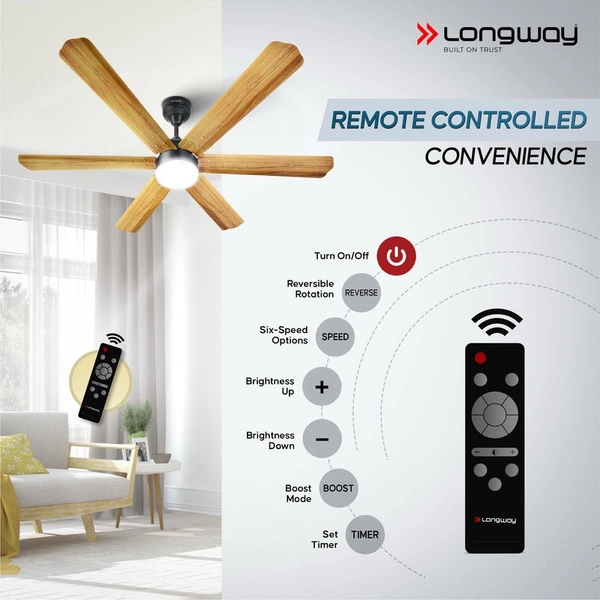 2. SMART REMOTE CONTROL: The Longway fan is equipped with a user-friendly Smart IR Remote, requiring no pairing for easy operation. With just a click, you can adjust the fan’s speed or activate special functions like timer, boost mode & sleep mode. The remote allows access to 6 different speed settings for tailored comfort.