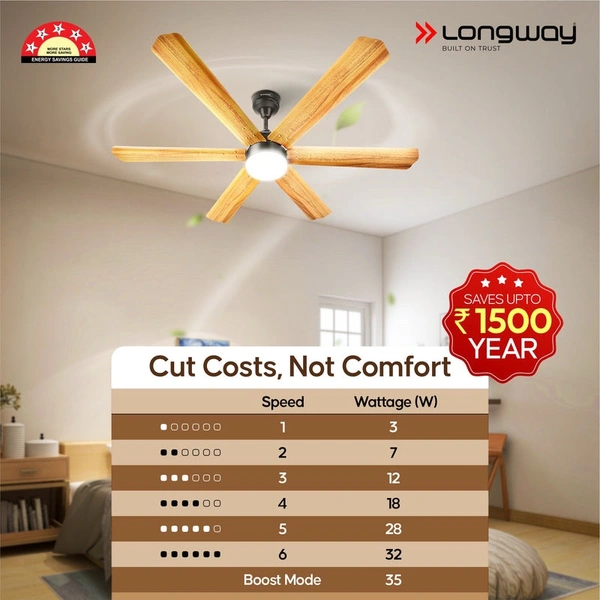 1. ENERGY SAVING: The Longway Luminair ceiling fan is powered by an advanced Brushless Direct Current BLDC motor, optimized for energy conservation. While using just 28W of power at maximum speed with its 5-star energy rating, this fan provides powerful airflow of 230 cmm at 300 rpm, achieving savings on electricity bills.