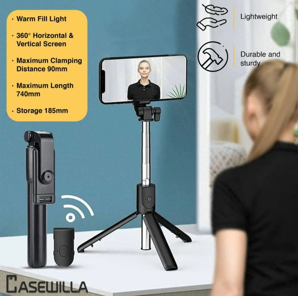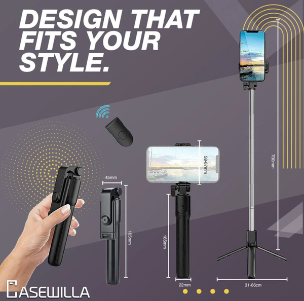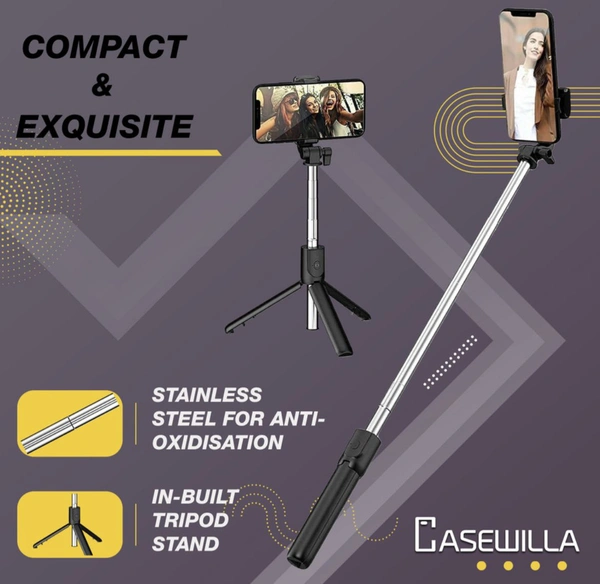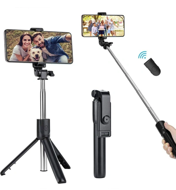 R1 Bluetooth Selfie Stick with Remote, 3- in-1 Multifunctional Selfie Stick, Tripod, Monopod Stand & Mobile Stand Compatible with All Mobile Phones Bluetooth Selfie Stick (Black, Remote Included)