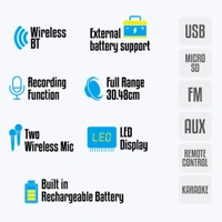 | Wireless BT / USB / Micro SD / FM AUX / Mic Input x 2 / Guitar IN x 2 | |