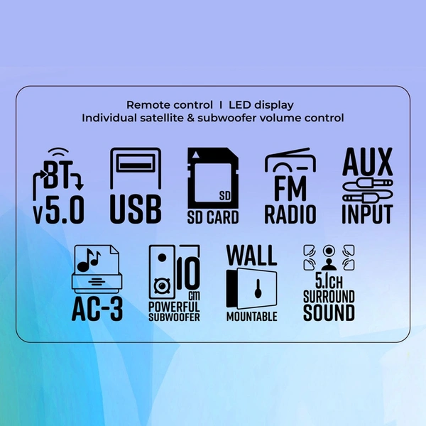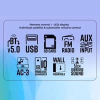 - BT v5.0 / USB / SD / FM / AUX / AC-3