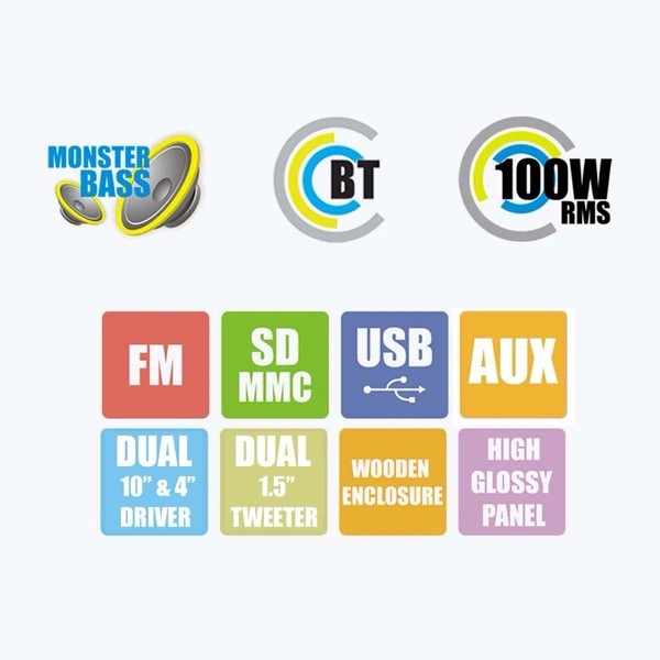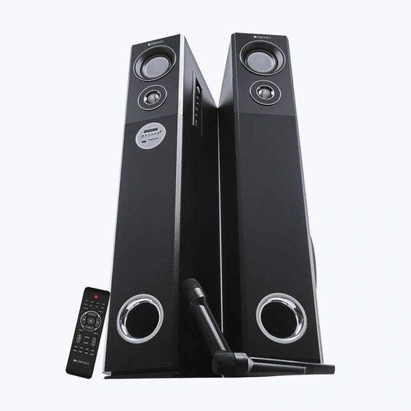 Enjoy a breathtaking sound experience with this powerful range of Tower Speaker. Whether watching a movie or listening to your favorite audio track, sound comes to life. Connectivity options: Bluetoothยฎ, USB, 3.5 MM AUX, FM Radio, SD/MMC Card. Dual Wireless Mic for Karaoke.