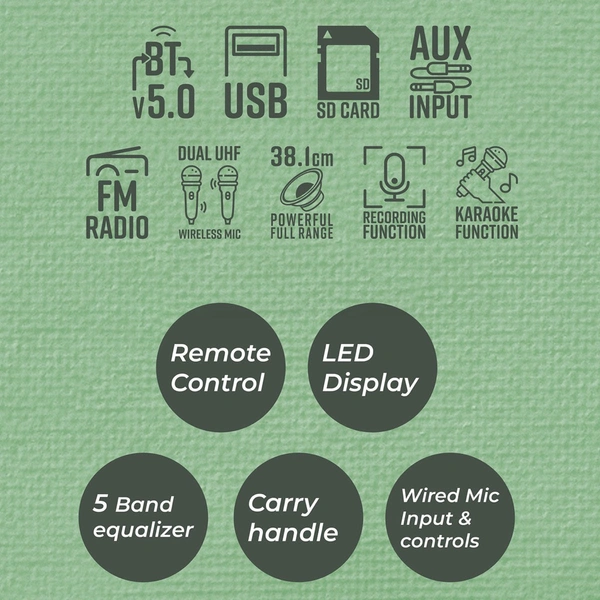 | BT v5.0 / USB / SD / FM / AUX / Mic Input | |