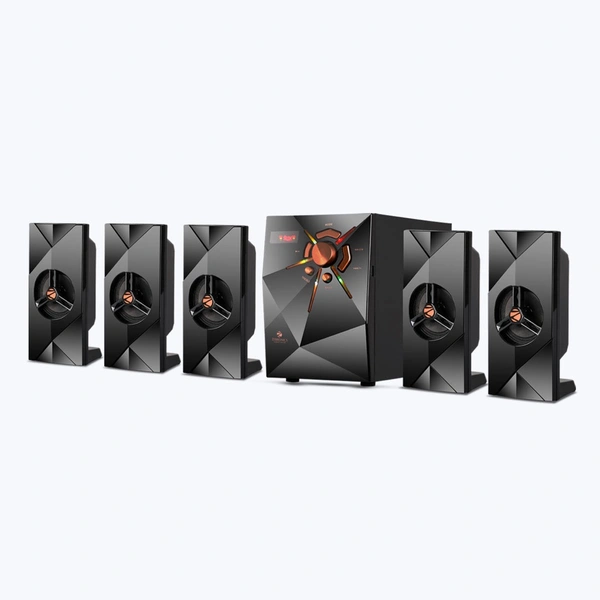 ZEB-Feel 5 is a 5.1 speaker featuring a stylish design with RGB and controls for volume/media in the front. Get a room thumping bass experience as the speaker has a 10.16cm subwoofer to deliver heavy bass. It has multi-connectivity options like wireless BT/ USB/ AUX and comes with a built-in FM Radio. Enjoy your entertainment at a press of a button on the remote control that tags along with the speaker.