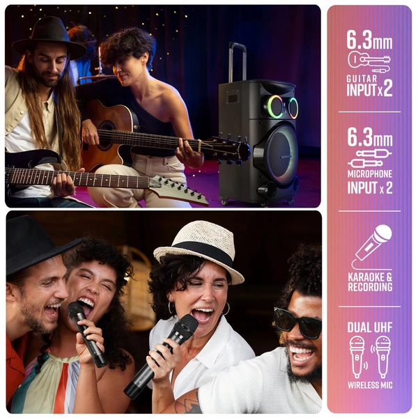 - BT v5.0 | USB | mSD | FM | AUX IN | MIC IN x 2 | GUITAR IN x 2
