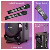 | Package Contents: | Speaker - 1 U, Power cord(1.5mm) - 1 U, Remote - 1 U, Wireless Mic - 2 U, QR Code Guide - 1 U, Input cable - 1 U , DC cable - 1 U |