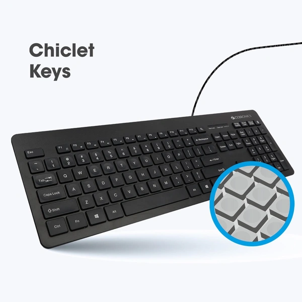 ZEB-K4000M is a wired keyboard that comes in a premium look slim design featuring 104 chiclet keys that include 14 multimedia keys for effortless typing. The keys come coated with laser printed key caps to last long and they come with a silent operation so that you can type without noise.