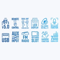 - Wireless BT v5.0 / USB / SD / FM / AUX / Mic Input x 2 / Guitar IN