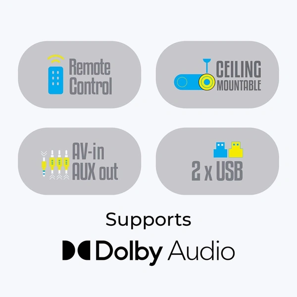 Connect your Laptop, PC, DVD/Blu-Ray player, etc easily and seamlessly with HDMI. Older devices can connect as well with VGA port which includes laptop, PC, PS2, etc. Connect your pen drive easily and watch your favorite shows, movies, and images in HD, it also comes with support for Dolby Audio. Connect your home theater to AUX for high-quality audio. |