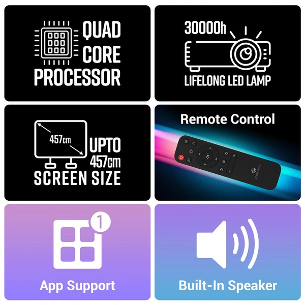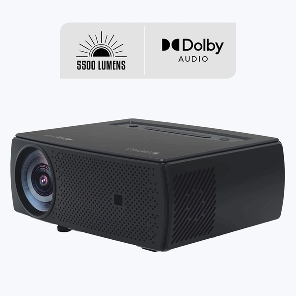 ZEB-PixaPlay 15 is a 1080p FHD Smart LED Projector. It comes with a Quad-core processor that makes it super easy to install and browse apps like YouTube, Netflix, & more via inbuilt Wi-Fi. The smart projector delivers the ultimate home theater experience with an impressive screen size of up to 457cms. Get crystal clear picture quality with 5500 lumens. The smart LED projector has multi-connectivity options like BT/ AV in/ AUX out, Dual USB, HDMI and has a built-in speaker.