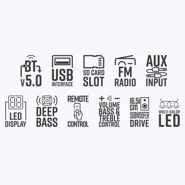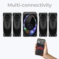 The 4.1 speaker features multi-connectivity options like the latest BT v5.0 so you can play your audio wirelessly. The speaker has connectivity options like you can use a pen drive to connect to the USB. You can insert a memory card via the SD card slot. Connect your laptop, desktop, or TV/DTH to the AUX, and the speaker also comes with a built-in FM Radio feature. |