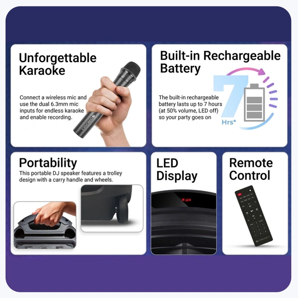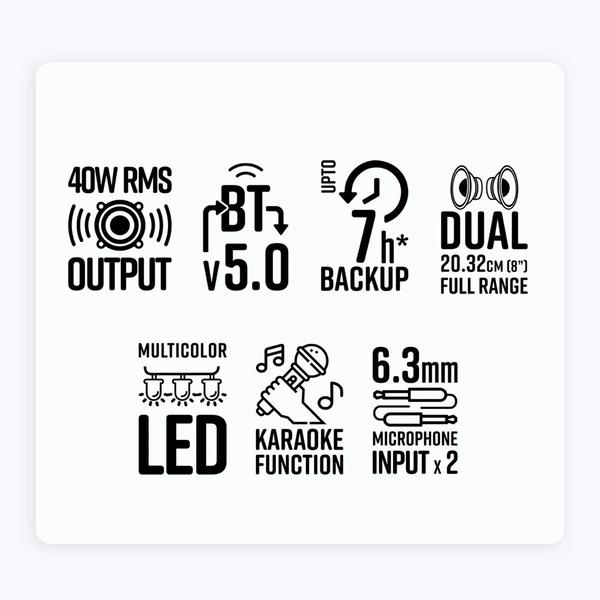 | Package Contents: | Speaker - 1 U, Power cord - 1 U, Remote - 1 U, Wireless Mic - 1 U,MIC clamp - 1 U, QR Code Guide - 1 U, Input cable - 1 U |