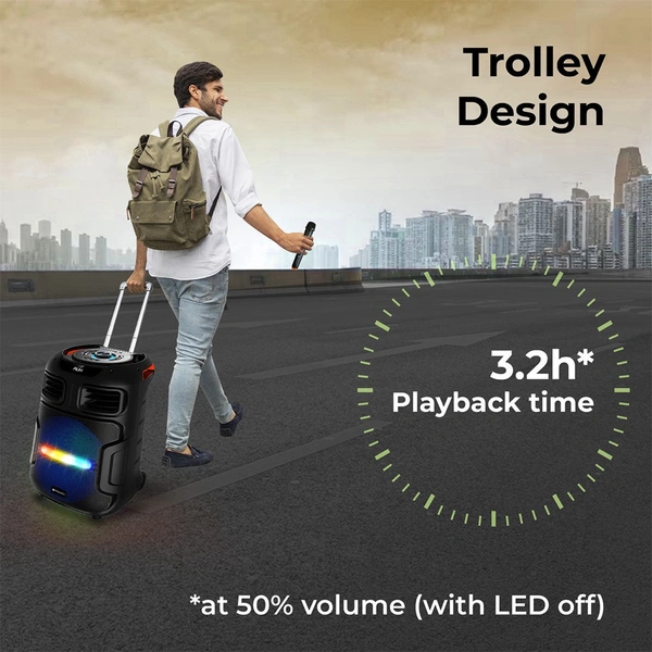 Your party won't even notice a slight slowdown owing to the built-in rechargeable battery, which lasts up to 12 hours (at 50% volume & LED off), and its charge is indicated by LED. |