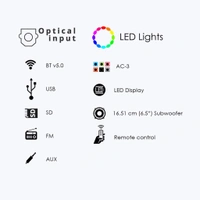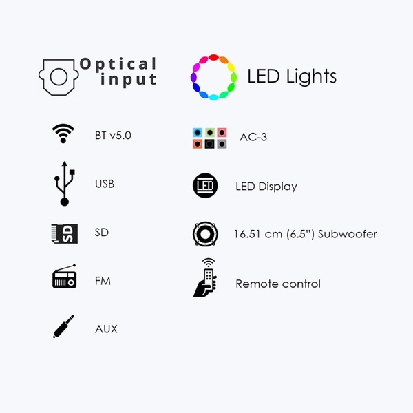 - Wireless BT / USB / SD / FM / AUX / AC-3 / Optical