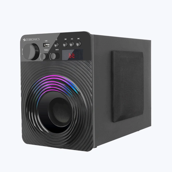 ZEB-Udaan Pro is a 2.1 speaker with powerful sound and excellent looks. Elevate your audio experience as the speaker features a multicolor LED that enhances the look and feel of the speaker. Take your bass experience up a notch as the speaker has a 10.16cms subwoofer driver that gives a thumping experience. Get all your quick volume/ media controls including your LED display right in the front that makes it super accessible.
