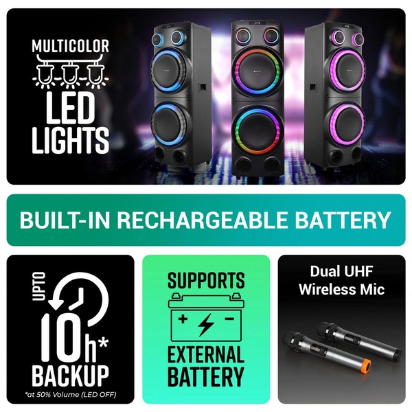 | Package Contents: | DJ Speaker - 1 U, Remote 0 1 U, Wireless Mic - !U, QR Code Guide - 1 U, Input Cable - 1 U, Power cable - 1 U |